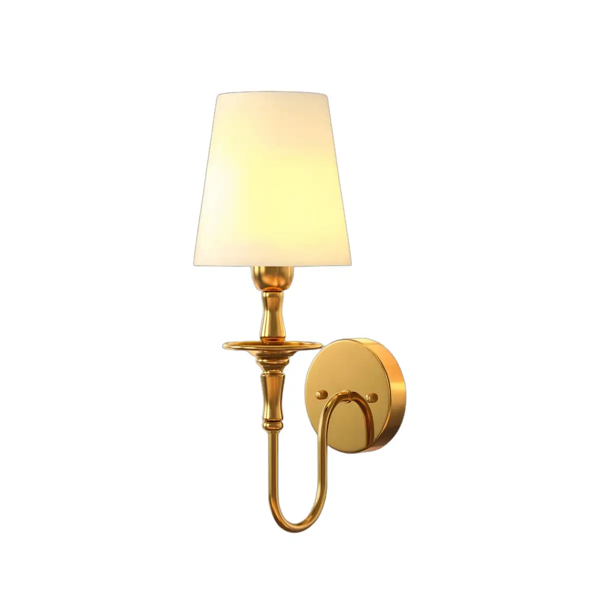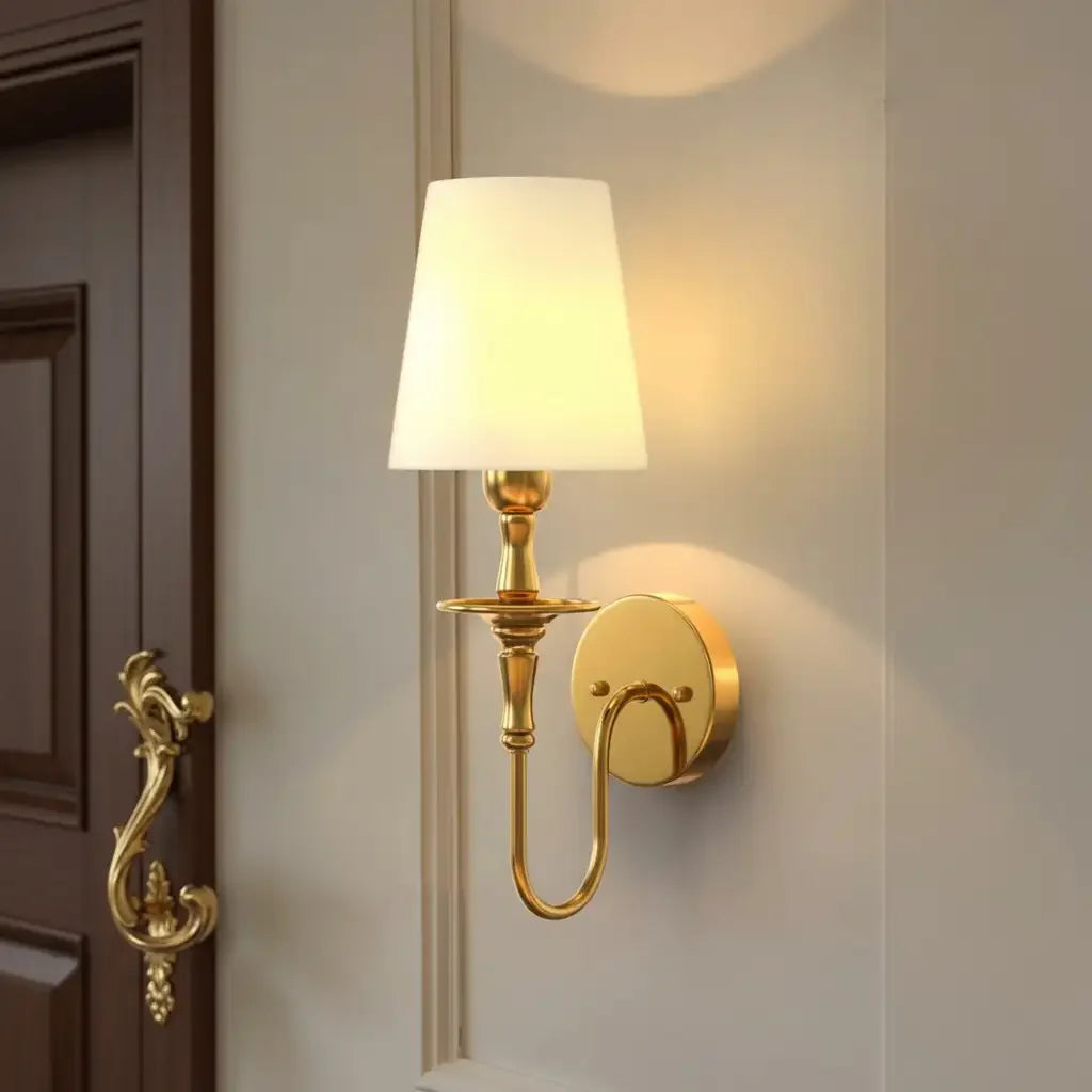 This retro classic 1-light wall sconce features a gold curving arm and soft fabric shade. Blending timeless elegance with warm glow, it elevates bedrooms, hallways, and living spaces with luxurious vintage charm.