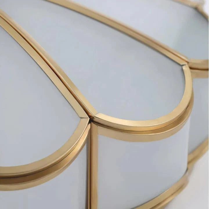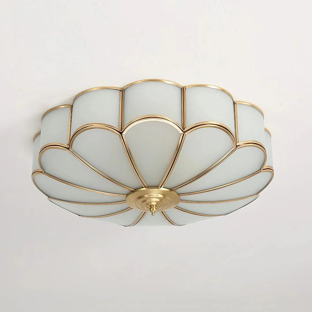 Crafted with delicate floral-patterned glass petals, this ceiling light creates intricate shadow patterns that enhance its vintage charm. The textured glass softly diffuses light, producing a warm, ambient glow perfect for dining rooms, cafes, or classic-style interiors.