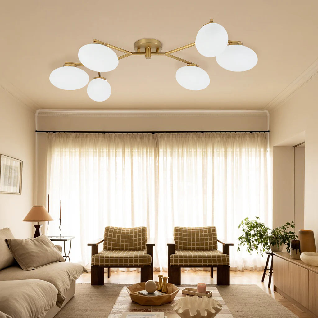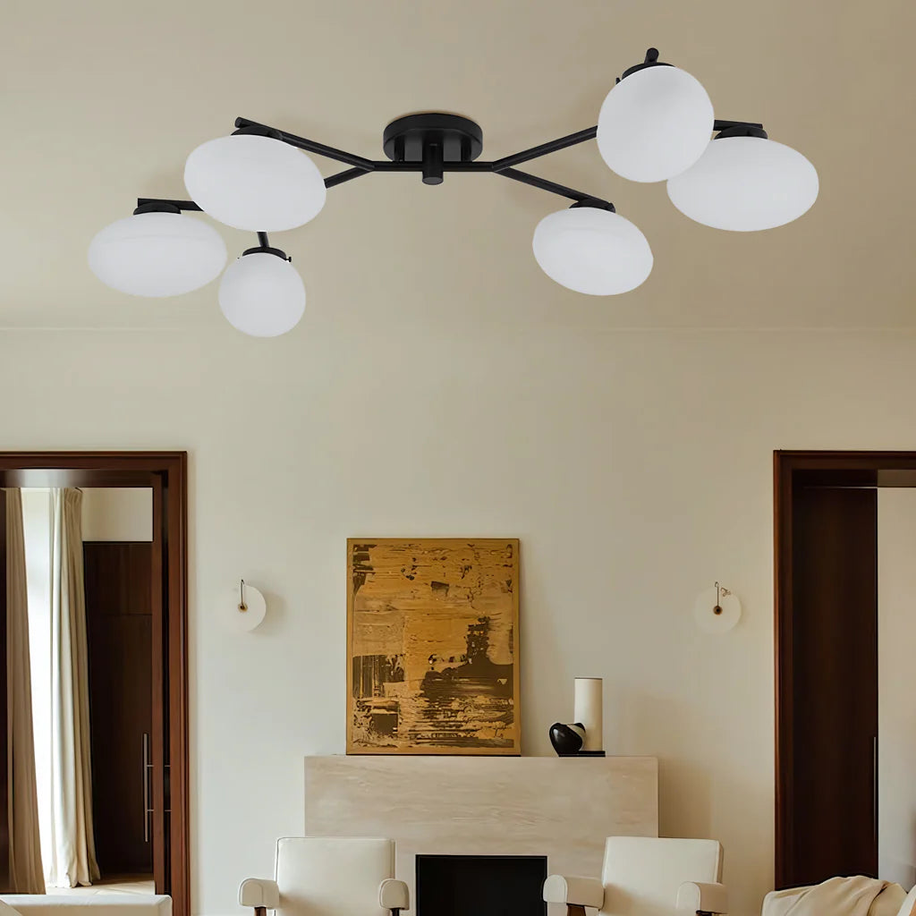 Meet our stunning 6-light elliptical glass globe linear semi-flush mount, a fusion of modern grace and timeless style. Featuring six frosted elliptical shades, it casts a warm, inviting glow. Inspired by the sputnik design, this sleek ceiling light boasts durable metal arms and a sophisticated linear arrangement. Perfect for lower ceilings, it's a standout addition to any home or office.