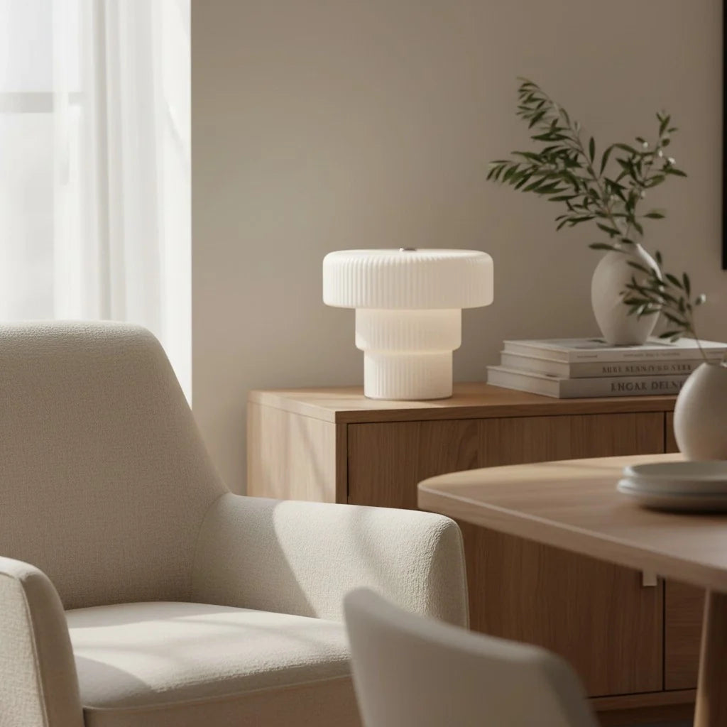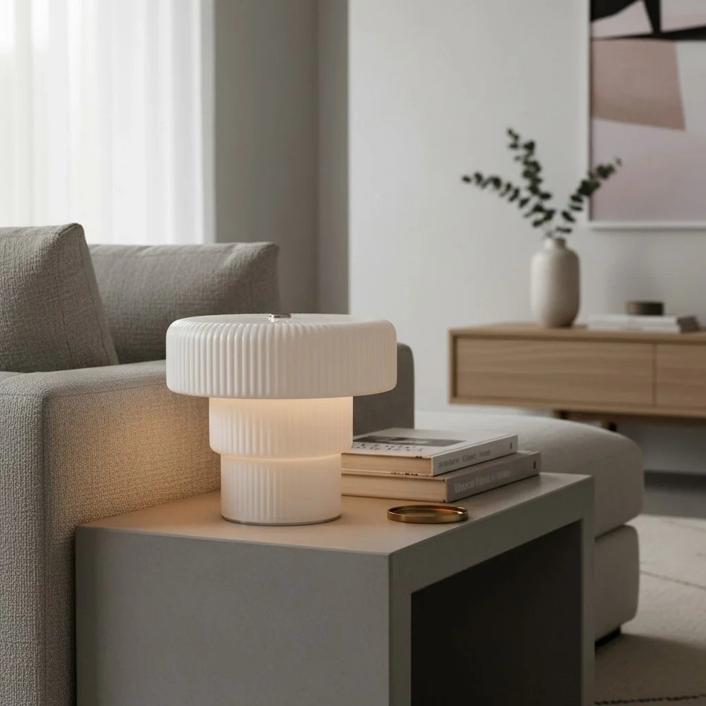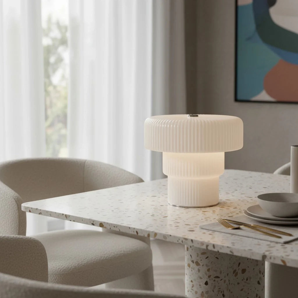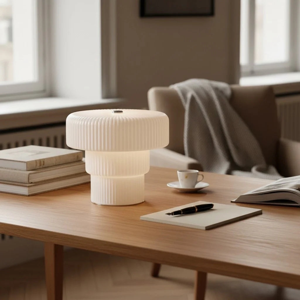This desk lamp is crafted from perfectly hand-blown glass with a corrugated surface and a milky white finish. Lightweight yet durable, it's an ideal choice for a desk or side table.