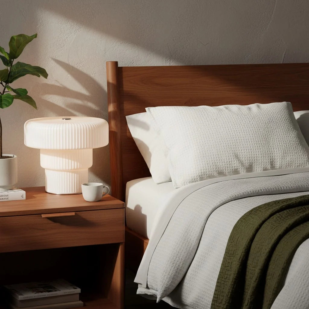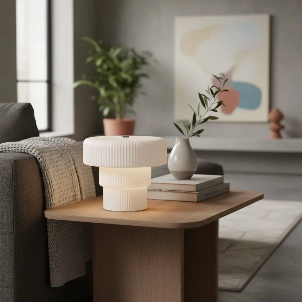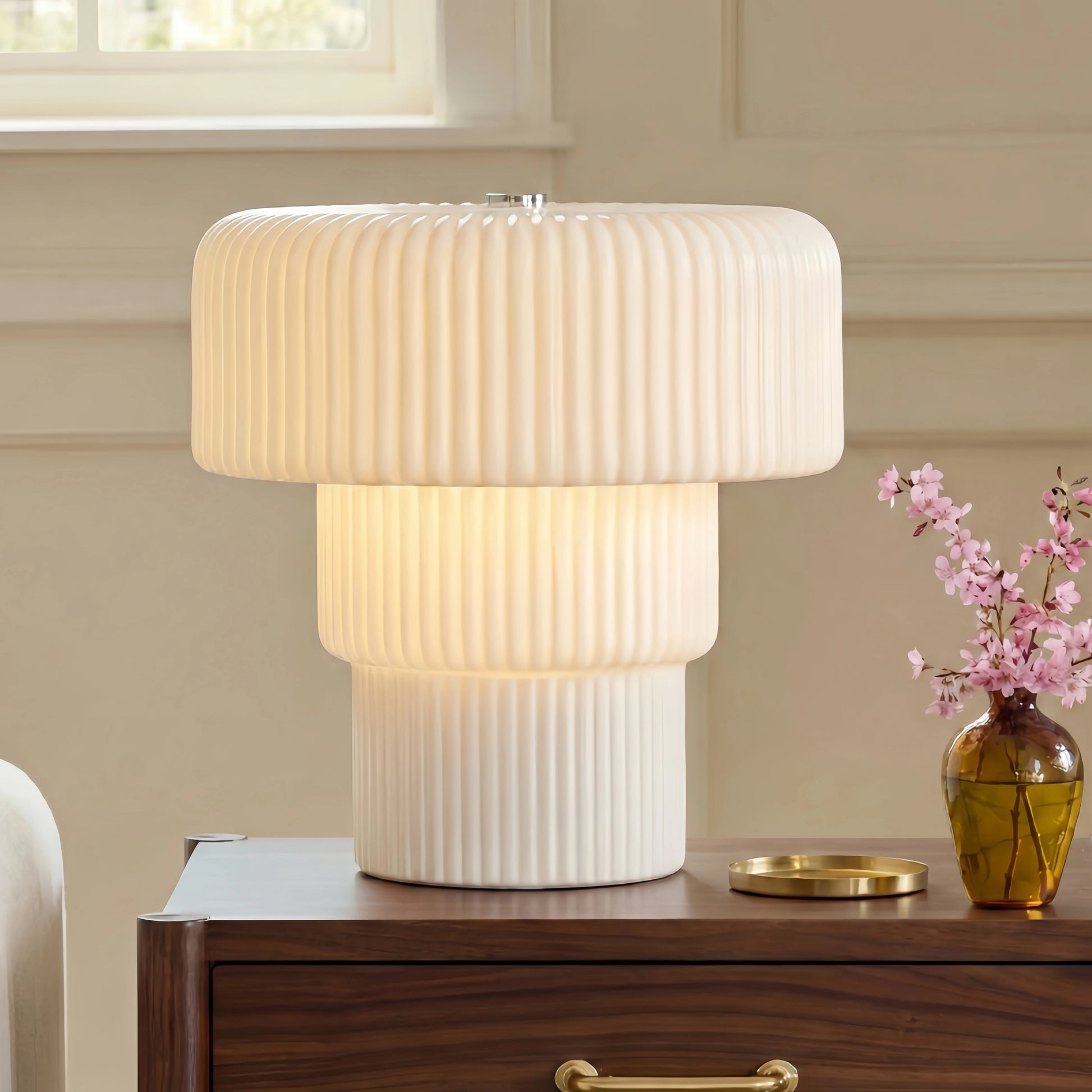 This desk lamp is crafted from perfectly hand-blown glass with a corrugated surface and a milky white finish. Lightweight yet durable, it's an ideal choice for a desk or side table.