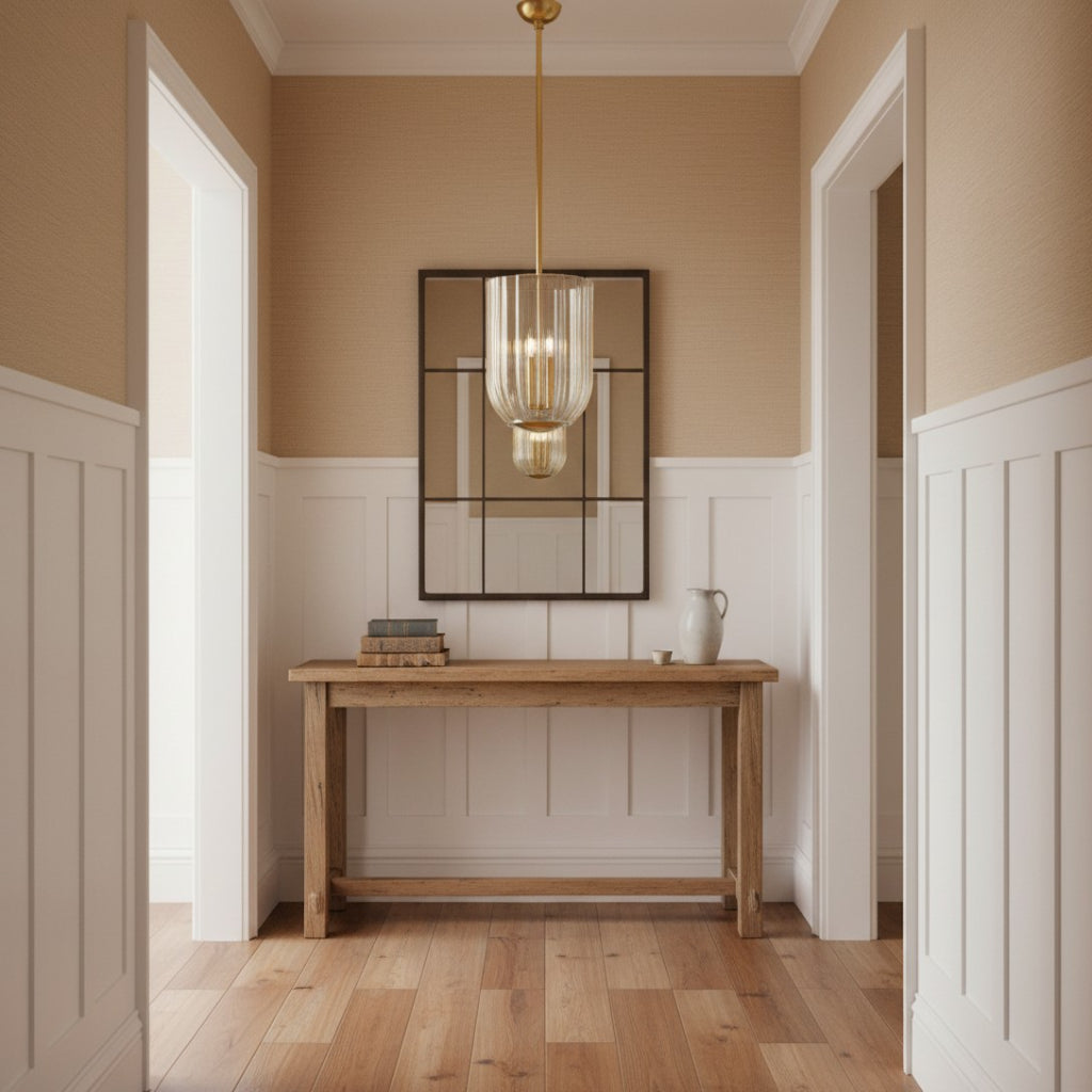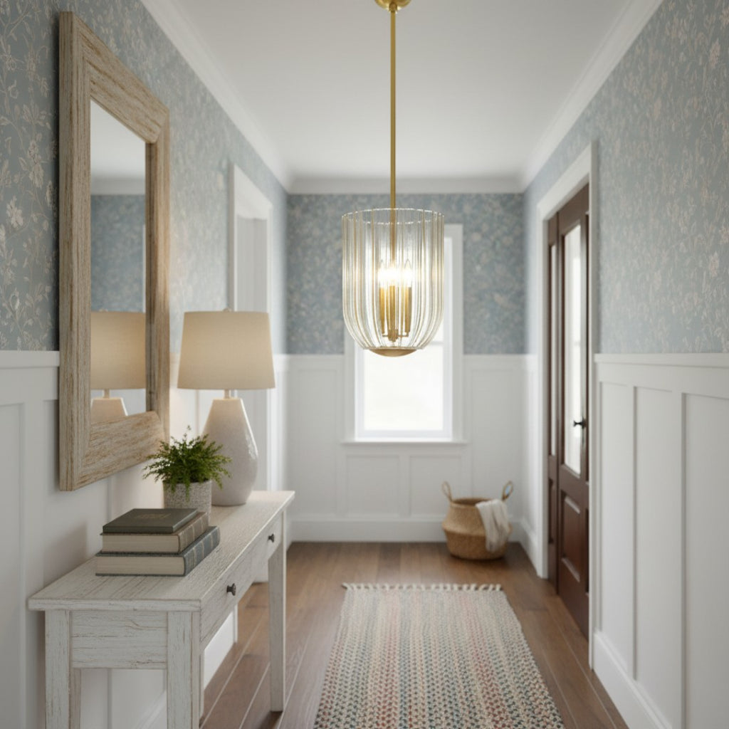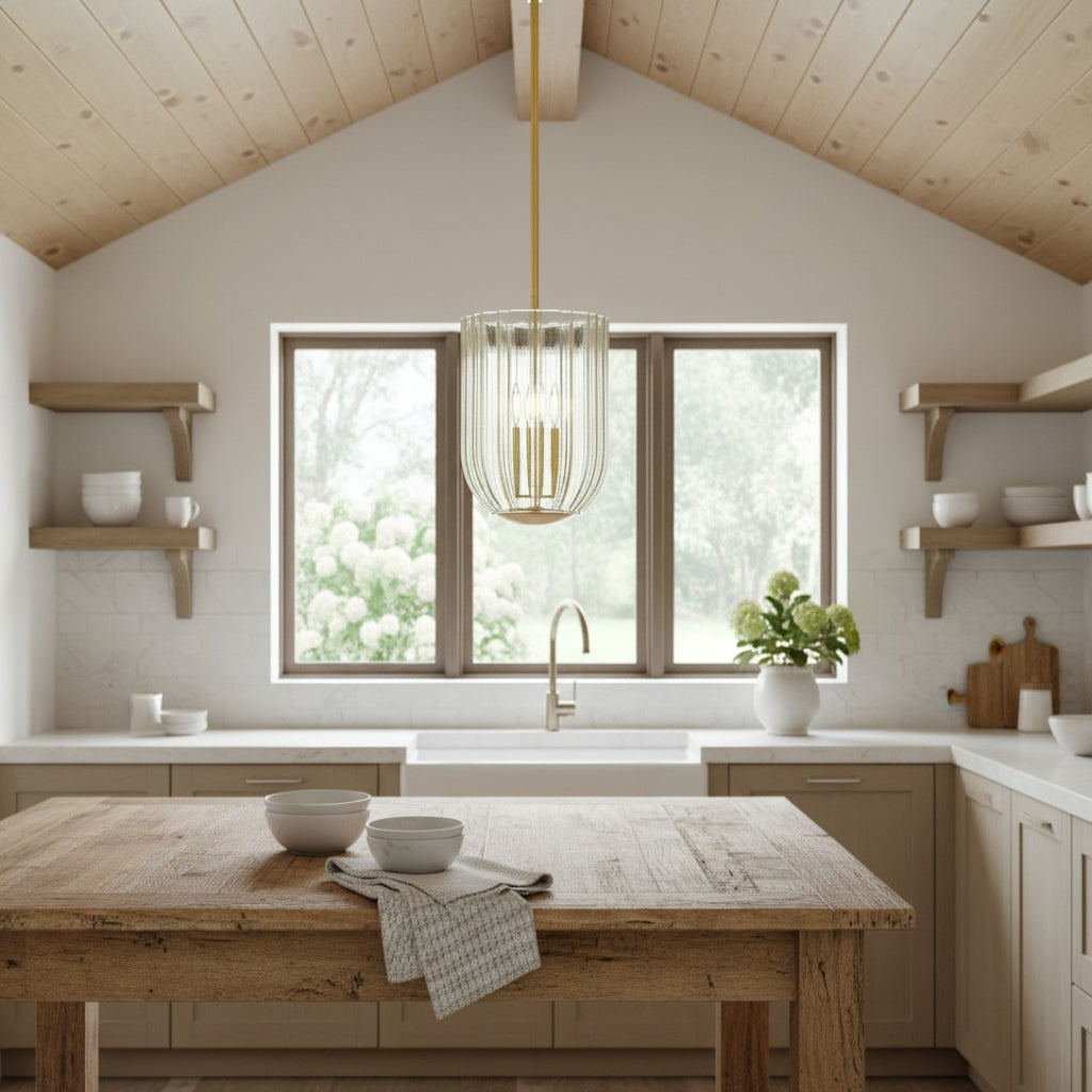 Elevate your space with the Glass Pendant: a stunning blend of champagne ribbed glass and polished aged brass-finished steel. Its sleek, vertical-textured shade diffuses warm, elegant light, while the adjustable height (via included poles) lets you tailor it to your ceiling. Crafted to UL safety standards and built to commercial-grade durability, this imported pendant adds a luxurious touch to bedrooms, entryways, or living spaces.