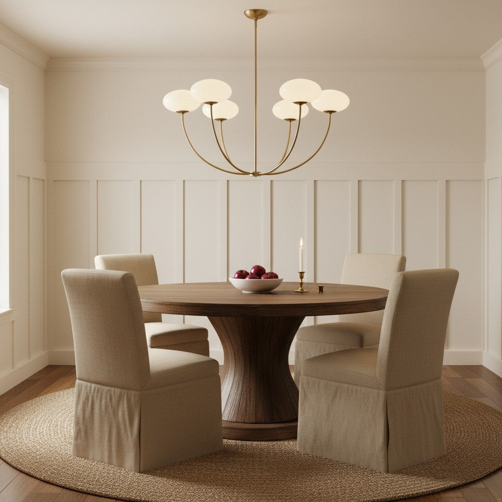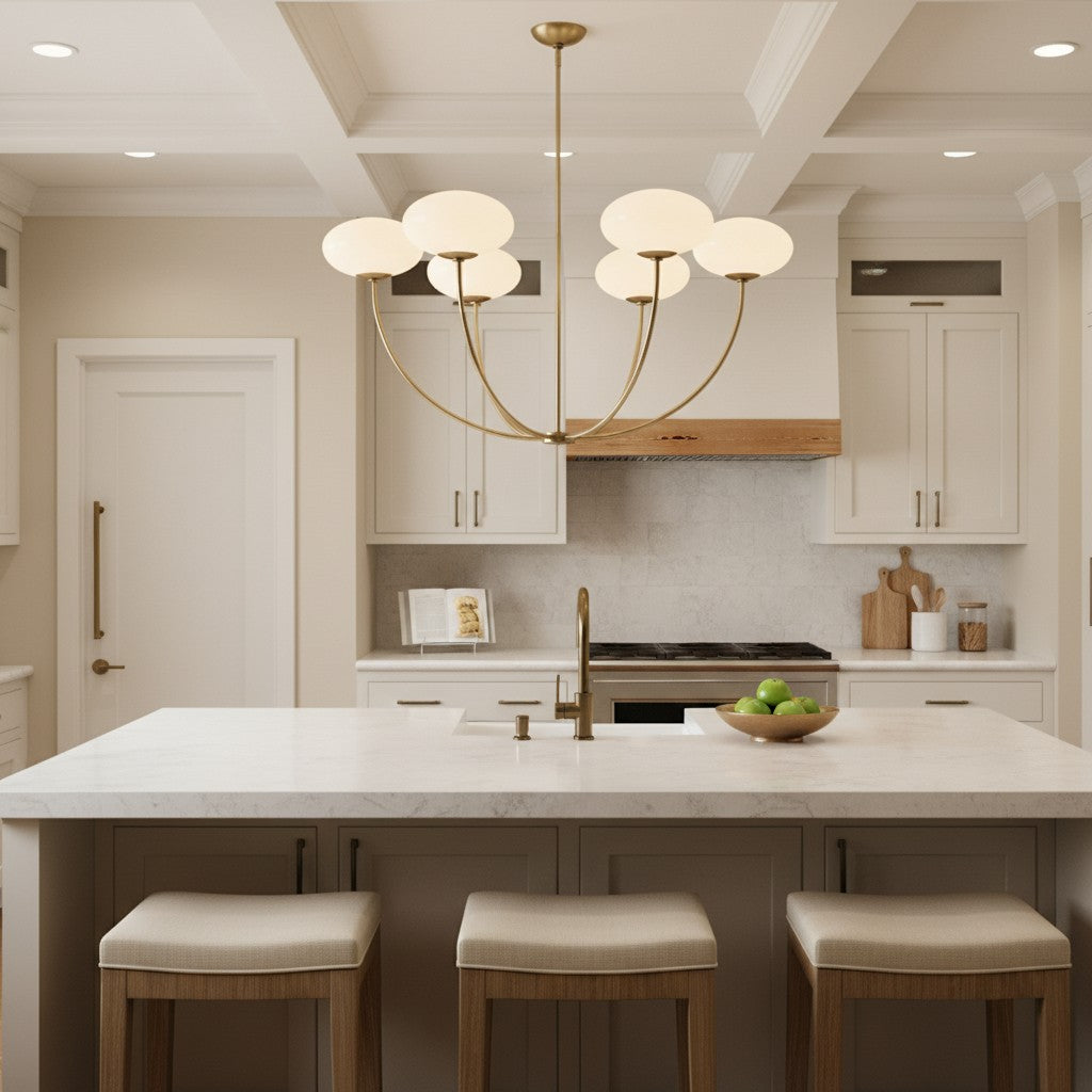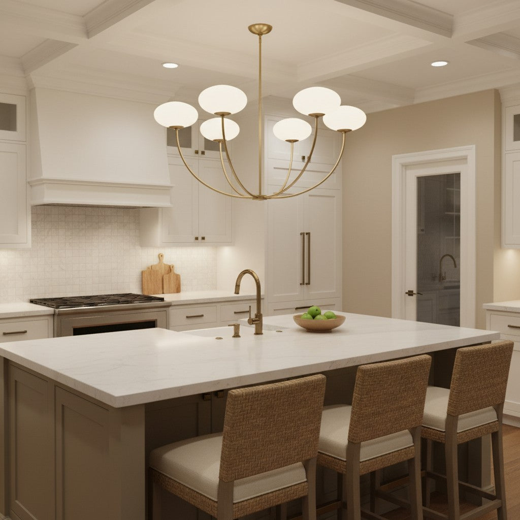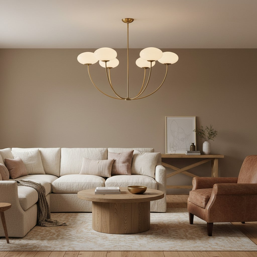 Sputnik chandelier and modern 6-light chandelier featuring white glass globe shades for a contemporary aesthetic. This elegant glass globe pendant light is an ideal ceiling fixture for your living room, kitchen island, dining room, bedroom, or hallway. The mid-century modern design and minimalist metal frame provide sophisticated illumination while enhancing the interior decor of any home or office space. Crafted for durability and style, this versatile hanging light fixture creates a warm and inviting atmosphere with its clean geometric silhouette and soft diffused lighting.