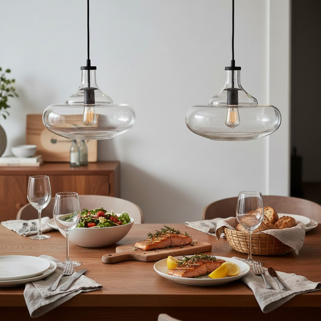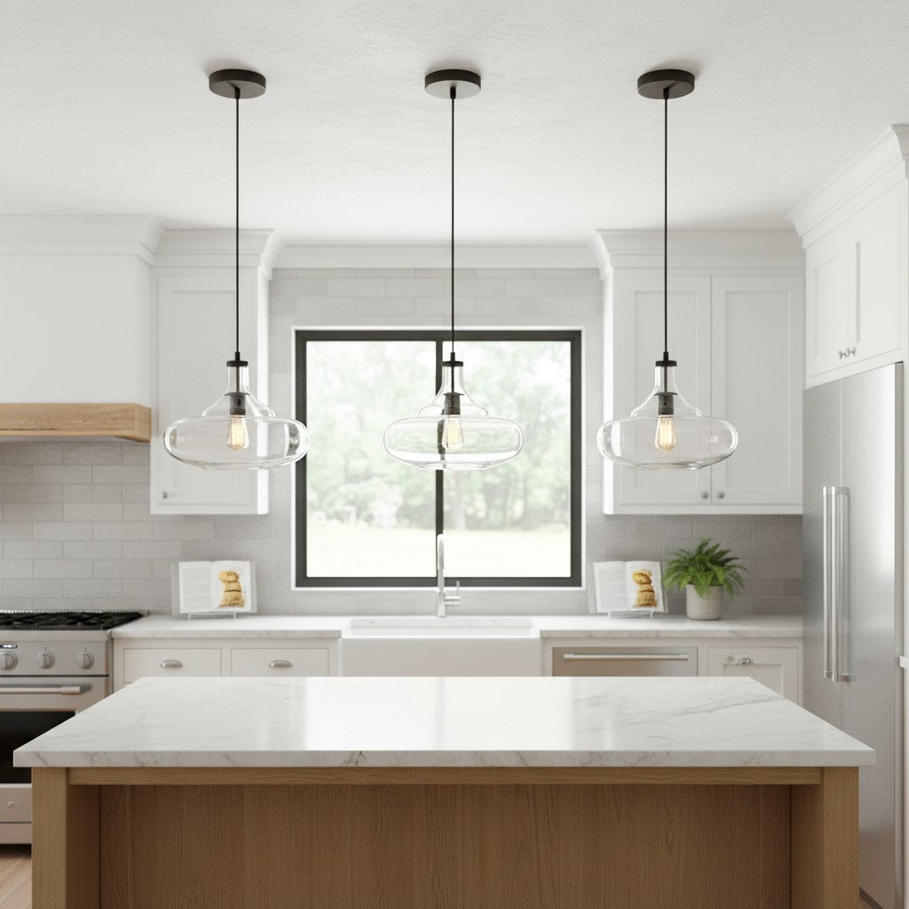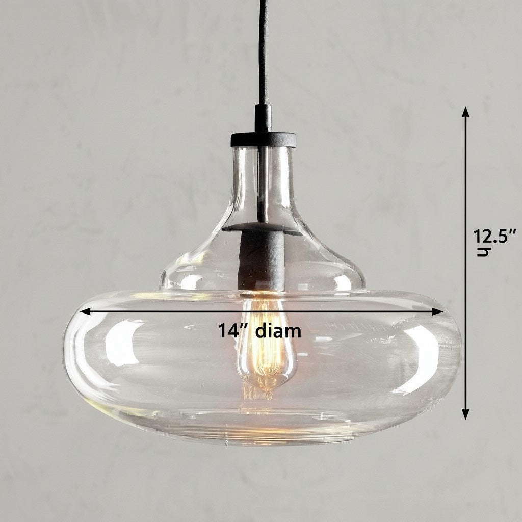 Industrial gourd glass pendant lights brighten your home with a perfect blend of vintage and modern elements. This gourd-shaped hanging lamp features a clear glass shade that adds a sophisticated touch to transitional decor styles. Antique bronze light fixtures serve as a durable and stylish addition to your kitchen islands or covered outdoor spaces.