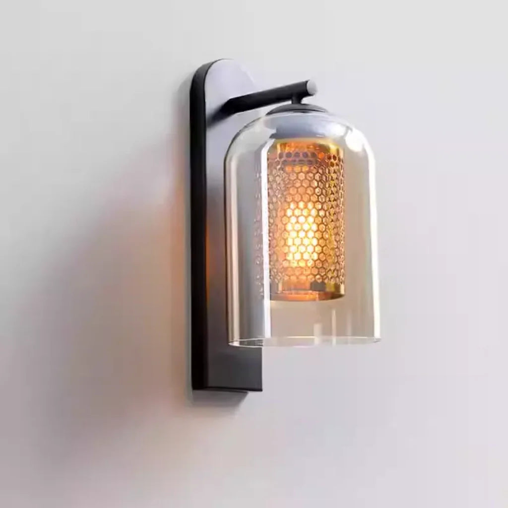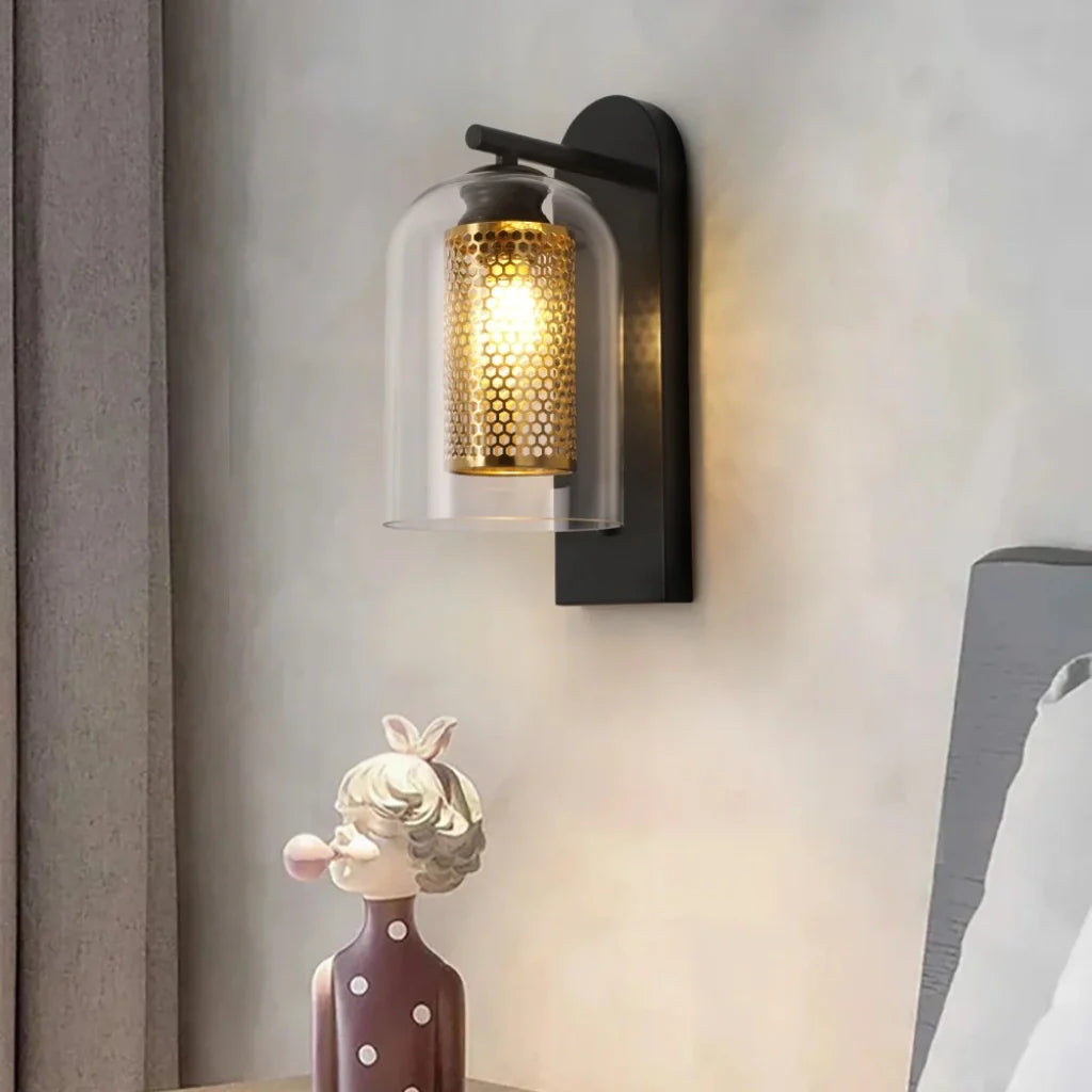 Give your space a modern feel with this stylish wall light. It features a black iron base, a clear glass dome shade, and a honeycomb interior, and emits warm and cozy light perfect for a bedroom, living room, or hallway.