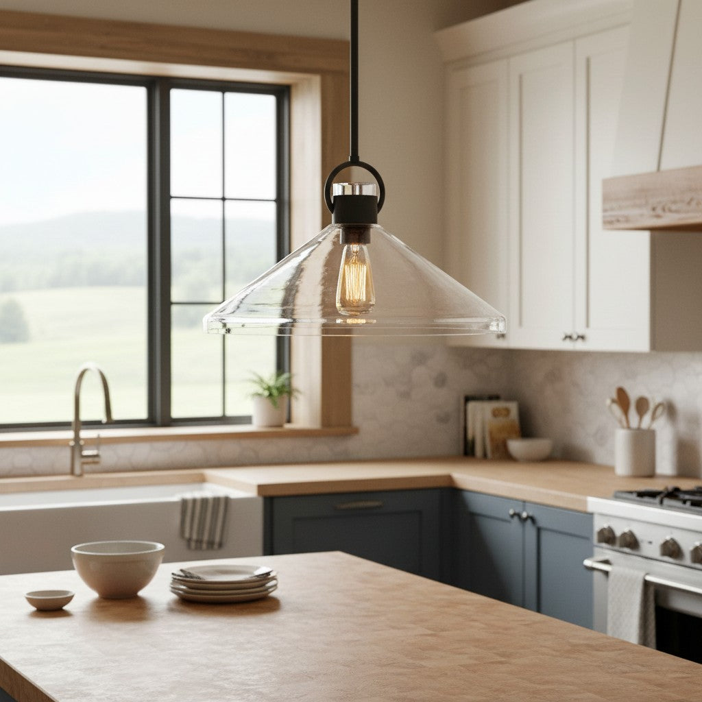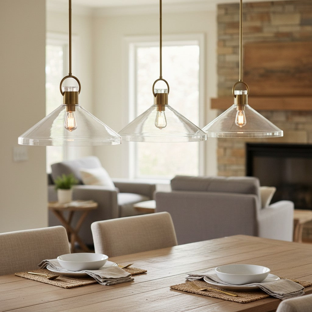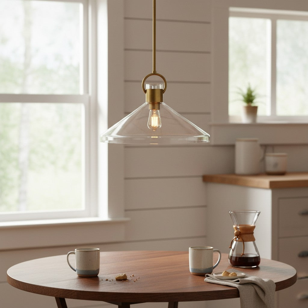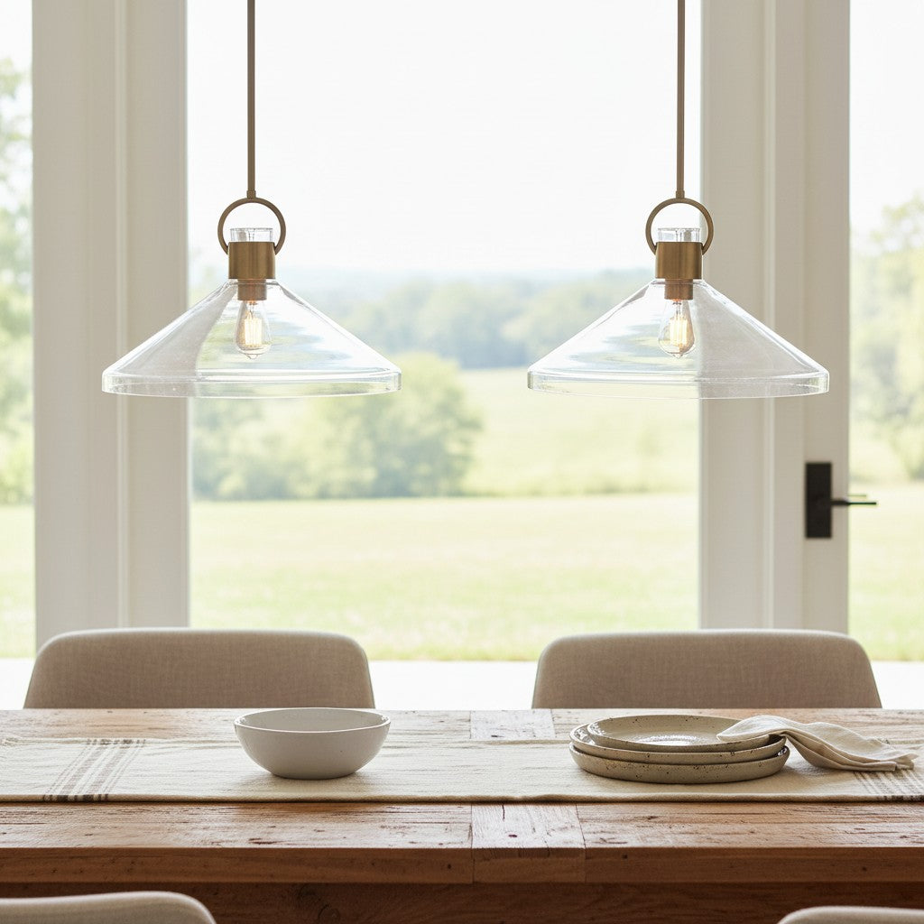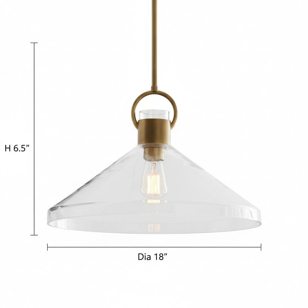 Modern Farmhouse Wide Cone Recycled Clear Glass Brass Pendant Light