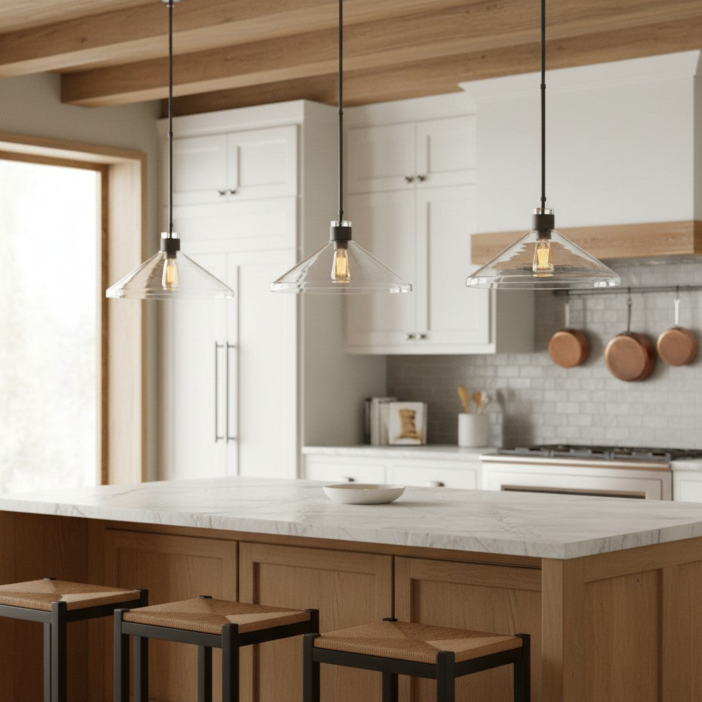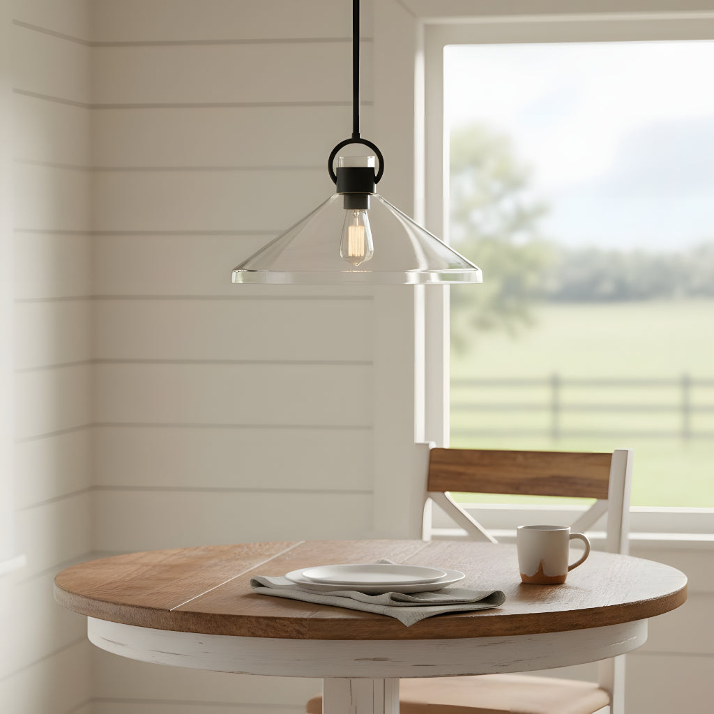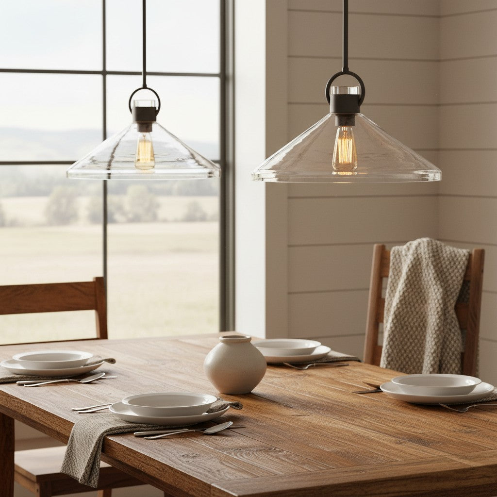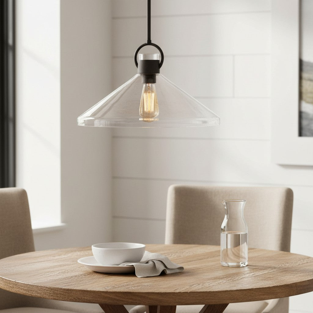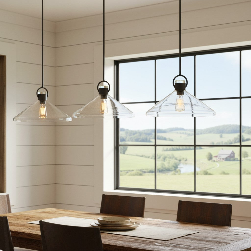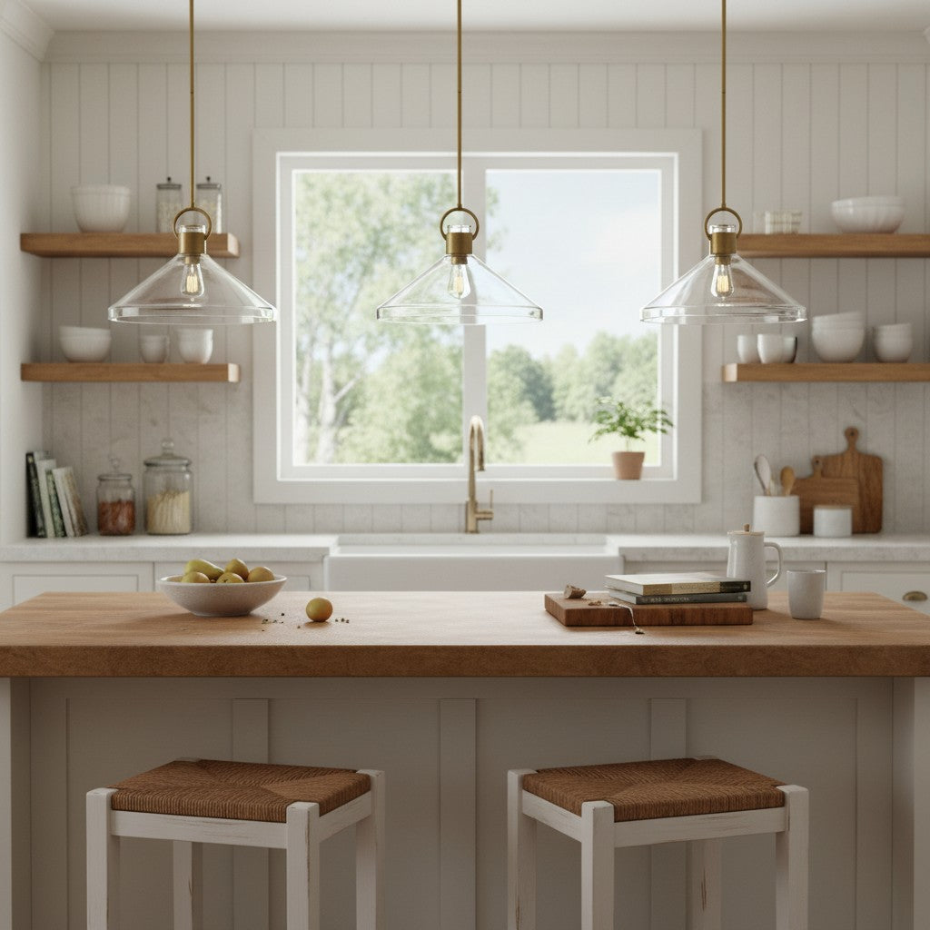 Modern Farmhouse Wide Cone Recycled Clear Glass Brass Pendant Light