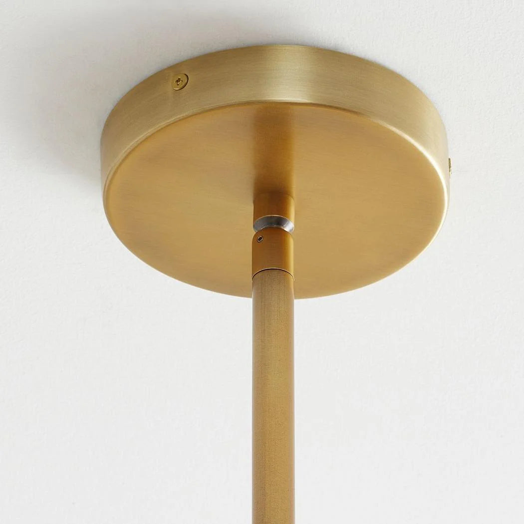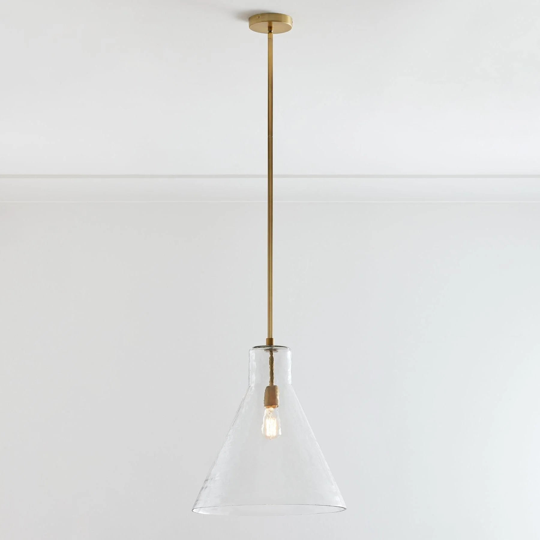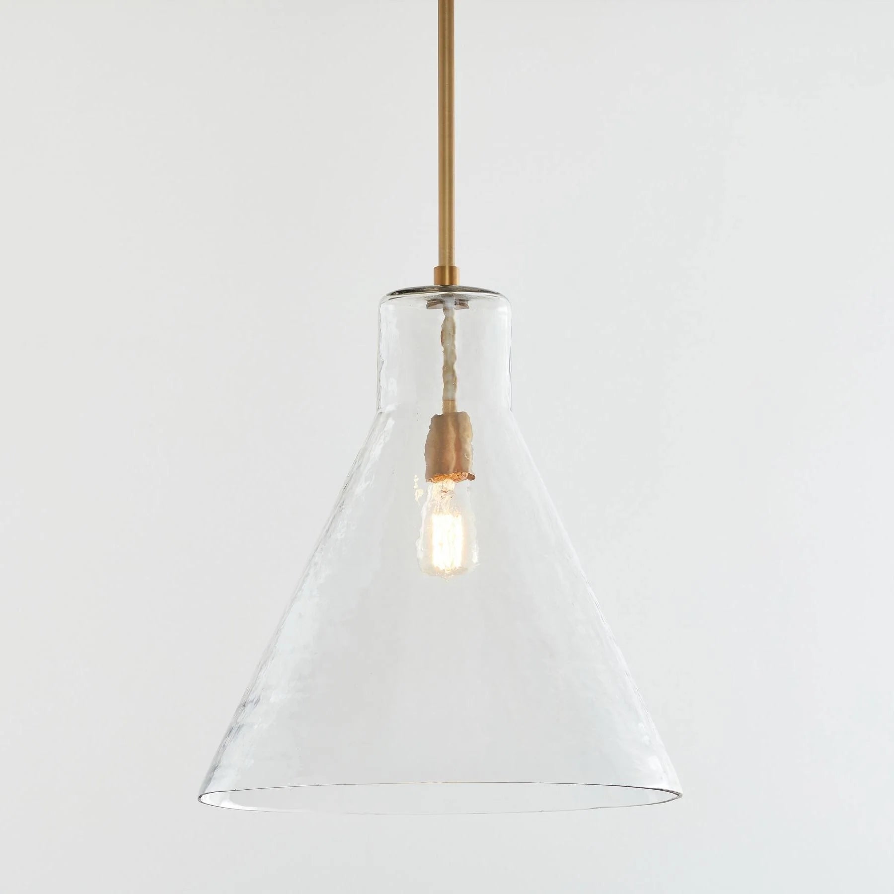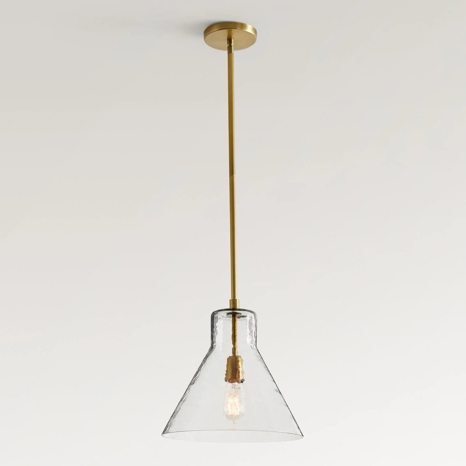 This pendant pairs minimalist form with artisanal texture. The hand-blown hammered glass shade features a clean cone silhouette that diffuses light beautifully, while the slim brass rod adds a warm, modern touch. Perfect for kitchens, dining areas, or over countertops, it brings understated elegance and subtle character to any space.