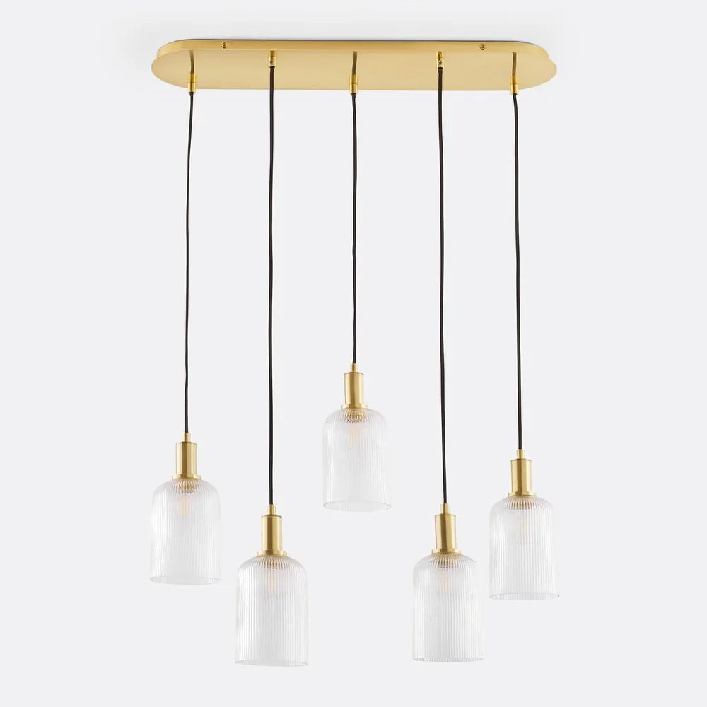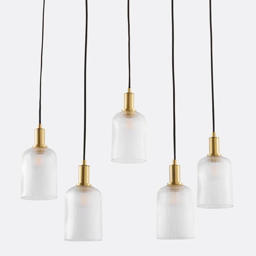 With its elegant brass frame and five ribbed glass lampshades, this chandelier offers a visually compelling design that enhances the atmosphere of dining rooms, living spaces, or entryways.