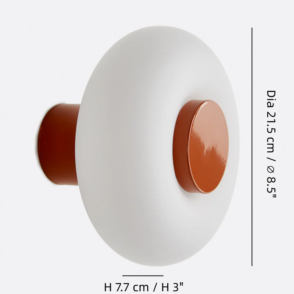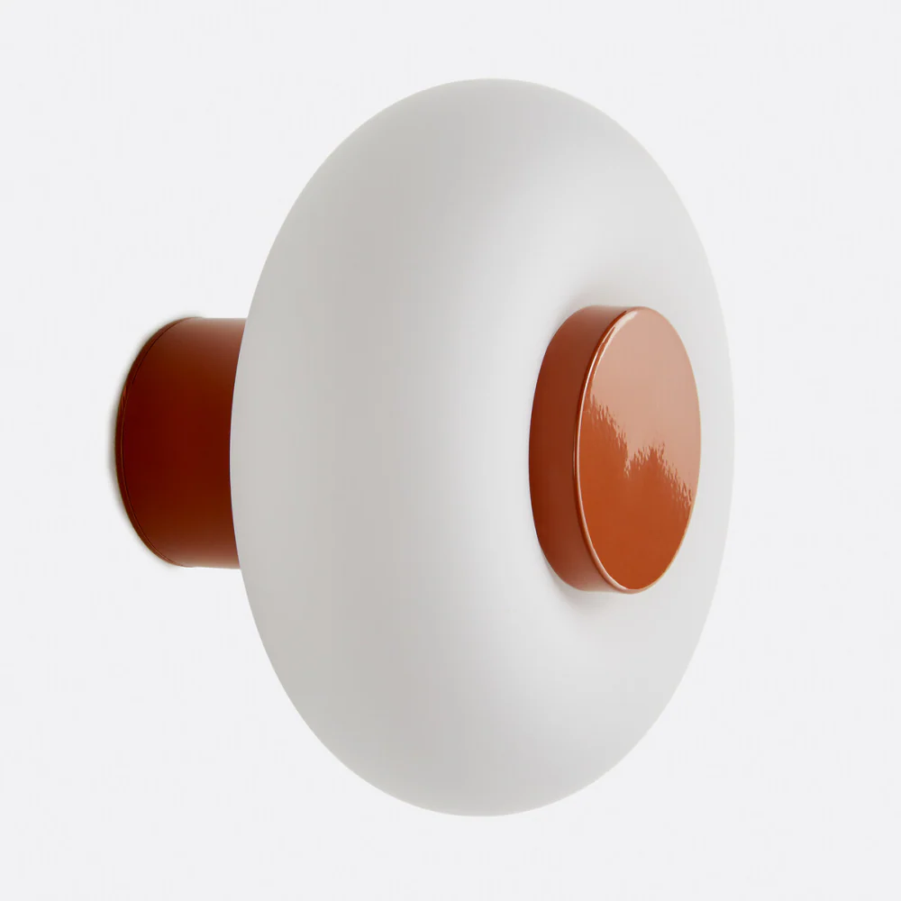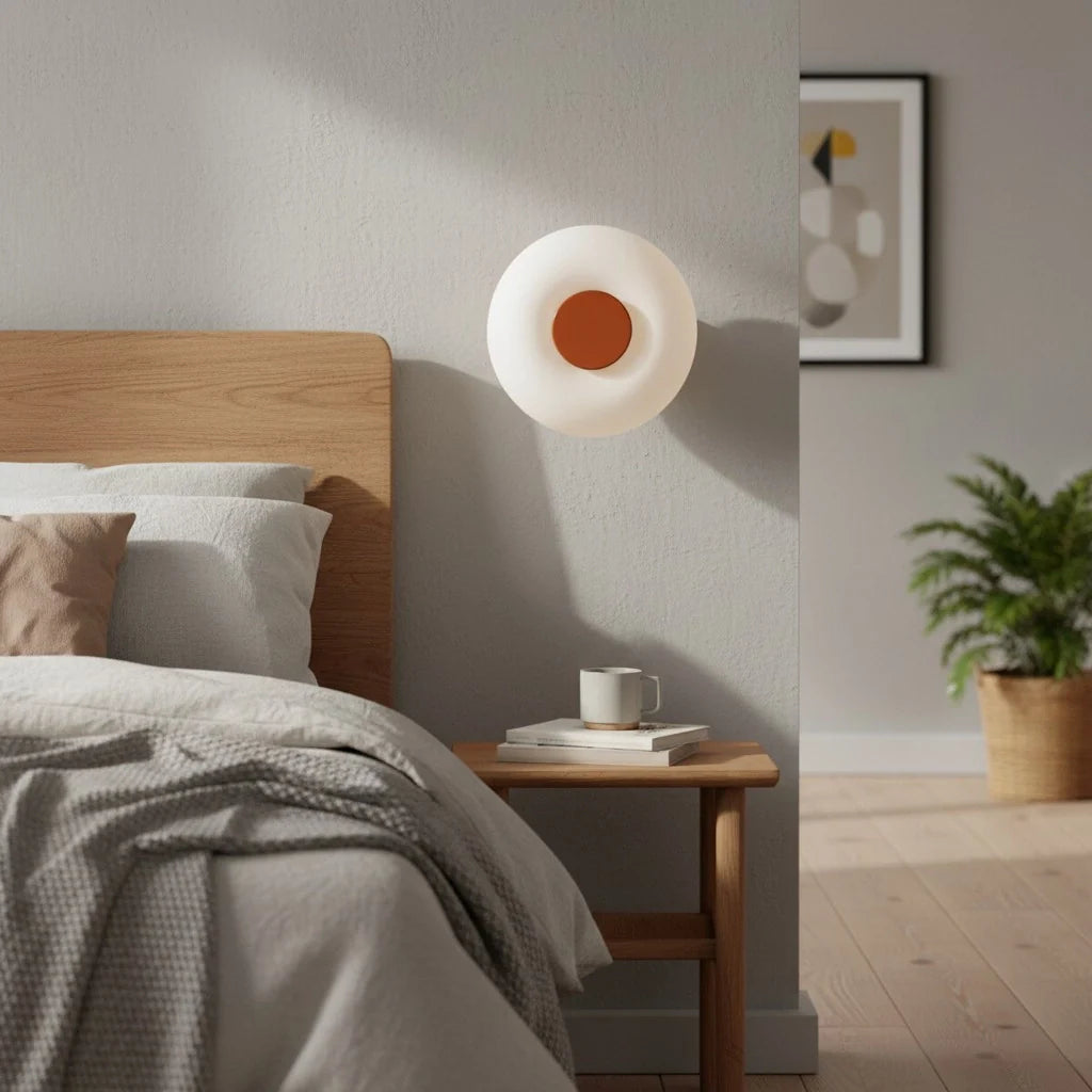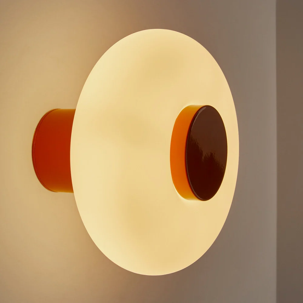 This wall lamp features a milky white glass shade with a matte finish, creating a soft, ambient light. Perfect for the bedroom, it seamlessly blends sleek minimalism with clever color blocking.